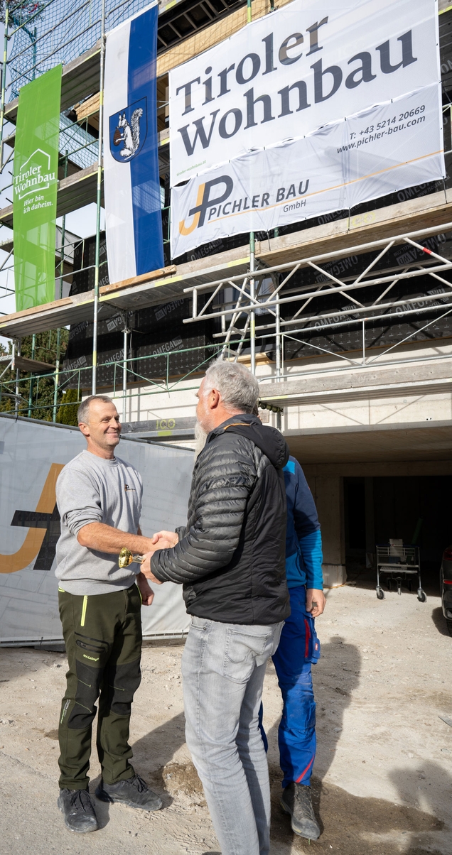 Am 14. November 2025 feierten wir auf der Baustelle am Loaweg in Götzens die traditionelle Firstfeier für fünf geförderte Eigentumswohnungen in Holzbauweise. Das Projekt am Loaweg 33 umfasst 2- und 3-Zimmer-Wohnungen mit 50 bis 83 Quadratmetern, eine Parkgarage mit fünf Stellplätzen, zwei Besucherparkplätze sowie qualitativ hochwertige Fahrradabstellräume und einen Müllraum. Begrünte Dachflächen, Wärmepumpe, kontrollierte Lüftung und Photovoltaik sorgen für Nachhaltigkeit und Komfort.